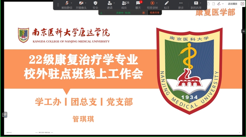为加强校外驻点班学生教育管理,4月2日晚17:30于线上会议召开22级康复治疗学专业校外驻点班线上工作会。会议由辅导员管琪琪老师主持,22级康复治疗学专业校外驻点班班委及部分同学参会。