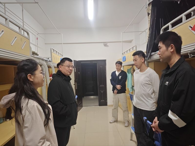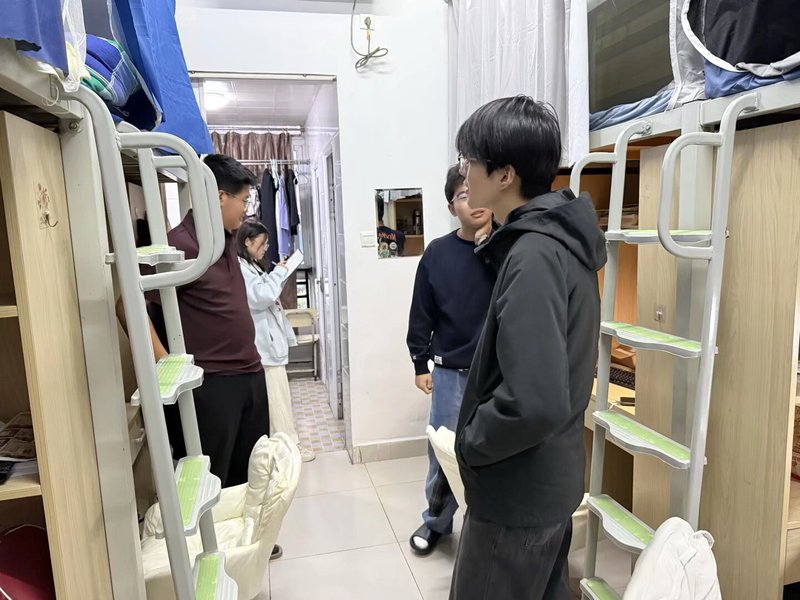 走访过程中,师生一行重点对宿舍用电安全、消防设施、物品摆放及卫生状况进行了全面检查,并对各宿舍环境卫生进行了评分。老师们与同学们亲切交流,详细了解大家的日常生活与学习情况,并围绕学业发展、社团活动及未来就业等方面给予指导。同时,检查团队特别强调了安全用电的重要性,提醒同学们严格遵守学校规章制度,杜绝使用违规电器,注意保持宿舍通风与整洁,共同维护宿舍安全。