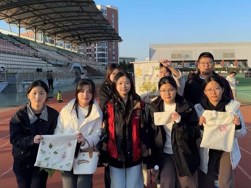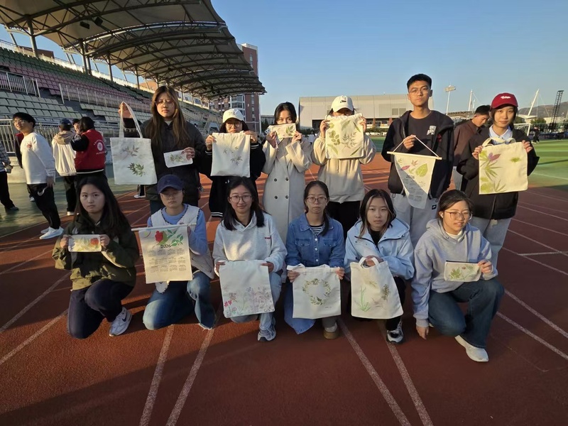 活动以植物拓印为核心内容。新生们领取帆布袋、胶带、橡胶锤等物料后,纷纷走进校园角落,采集新鲜叶片与花朵。创作过程中,大家以布为纸、以植物为墨,仔细摆放花叶、固定位置,再用橡胶锤轻轻捶打。随着力度的把控与手法的调整,叶片的纹路与花朵的色彩逐渐清晰地印在布面上。同学们相互探讨技巧、分享创作灵感,从花叶搭配到捶打节奏反复尝试。现场既充满专注创作的氛围,又洋溢着互助互动的欢乐。每一件作品都承载着大家对传统工艺的好奇与对校园自然之美的捕捉。