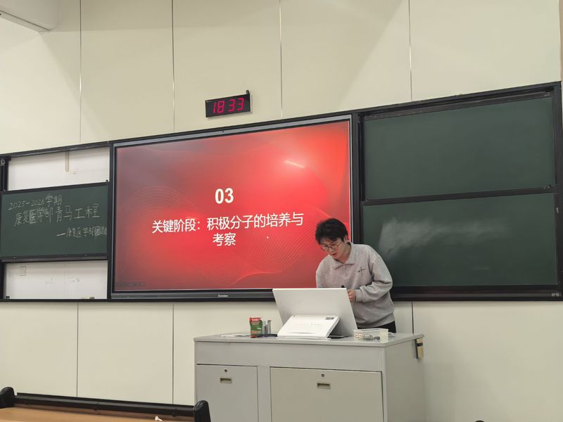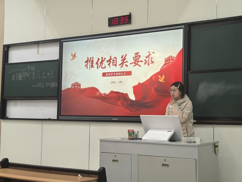 为深入学习贯彻党的二十大和二十届三中全会精神,强化青年大学生思想政治引领,康复医学部于11月24日在10-101教室举办了2025-2026学年秋季“青马工程”培训第三讲。本次培训特邀康复医学部团总支副书记王莉和组织发展部部长郑卓担任主讲。